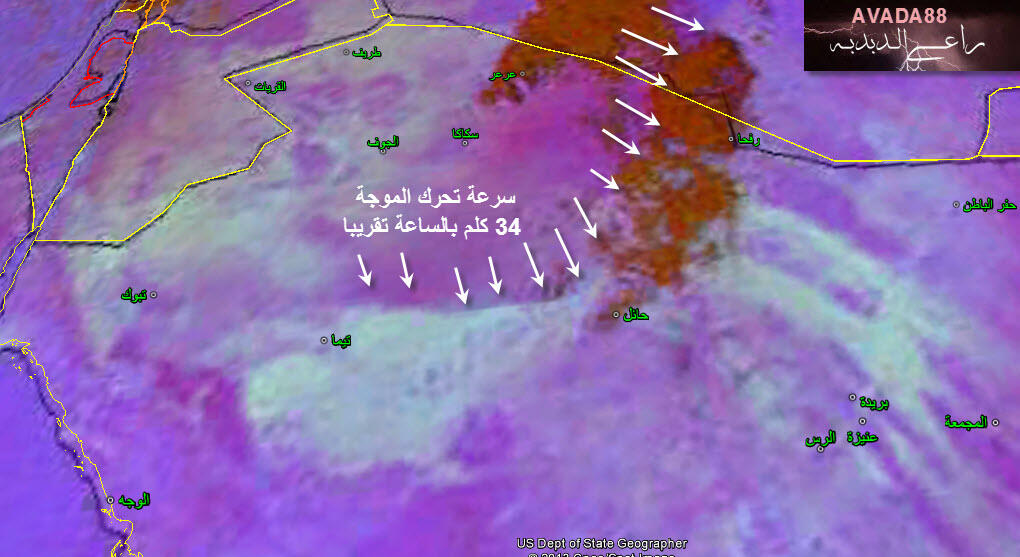 تشكلت الان عاصفة رملية على شمال غرب وغرب وجنوب غرب العراق وكذلك على شمال السعودية وهي بطريقها نحو المناطق الداخلية ولايستبعد ان تصل حفرالباطن مع منتصف هذه الليله او صبيحة يوم الغد الجمعة تحذير العاصفة الرملية حتى الان تعتبر كبيرة وقوية وهي بطريقها للتوسع اكثر فأكثر وهذا والله اعلم خروج ونلتقي بوقتً لاحق ان شاء الله |