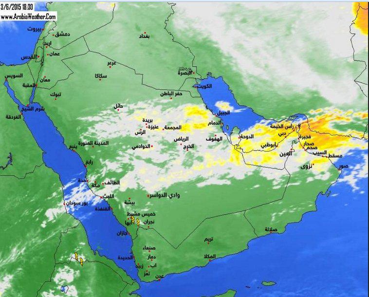 السلام عليكم ورحمة الله وبركاته ابارك للديار الممطور منطقة الرياض والقصيم وعسير ومنطقة حائل ولجميع الديار الممطورة ومتبوع خير ان شاء الله الشفية لاجديد اجواء مستقرة وحارة نسبيا خلال النهار ومعتدلة الى دافئة خلال الليل وهذا اليوم الجمعة ظهرت بعض السحب المتفرقة درجة الحرارة الان 27 درجة مئوية |