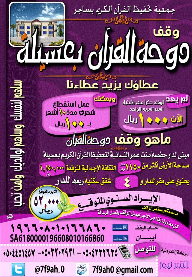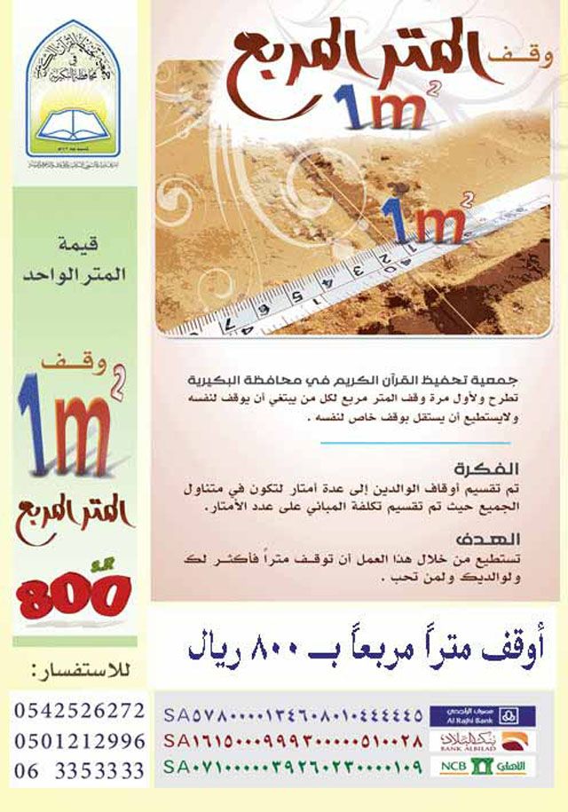 بسم الله الرحمن الرحيم أفضل مايمكن أن تساهم فيه وتدخر لنفسك عند الله يوم لاينفع مال ولابنون أن تساهم ولو بسهم واحد في أوقاف خدمت الإسلام والمسلمين أوقاف خدمت الفقير والمسكين وحافظ القرآن واليتيم والداعية ومعلم كتاب الله ومتعلمه والقائم عليه ونشرت الاسلام فلم تعد الاوقاف حكراً على الأغنياء فالفقراء كذلك يمكنهم بناء أوقاف والمشاركة فيها إليكم هذه الأوقاف التي سيستفيد منها آلاف المسلمين بإذن الله فلا تبخل على نفسك بالمساهمة فيها عنك وعن والديك ومن تحب ============ وقف الوالدين ============ الوقف تابع لمكتب دعوة الجاليات بالروضة فأوقف لوالديك بصدقة جارية تستمر مدى الحياة بإذن الله وهذه صفحة الوقف على موقع المكتب https://www.arrawdah.com/dimofinf/page.php?do=show&action=waqf https://i769.photobucket.com/albums/x...0.jpg~original للاتصال والاستفسار : جوال : 0538887670 جوال : 0533253530 للتبرع في بنك الراجحي ( حساب رسمي بأسم مكتب جاليات الروضة وسيخرج لك أسم المكتب على شاشة الصراف ) 296608010133000 للتحويـل من أي بنك آخر ( الآيبان ) SA8080000296608010133000 ============ وقف الدعوة النسائي ============ تابع للمكتب التعاوني للدعوة و الإرشاد وتوعية الجاليات بعنيزة. قيمة السهم 50 ريال وبالإمكان التبرع باي عدد من الأسهم من خلال هذا الوقف ستساهم بإذن الله في :- - إقامة 150 درس ومحاضرة شهريا . - دخول ما يقارب 20 مسلمة جديدة في الإسلام شهريا. - حضور ما يقارب من 300 امرأة و فتاة شهريا لمناشط المكتب الدعوية . - توزيع الكتب والمصاحف على الحاضرات من المسلمات وغير المسلمات . https://i769.photobucket.com/albums/x...5.jpg~original للاتصال والاستفسار : جوال / 0553643030 جوال /0553634040 للتبرع في بنك الراجحي ( حساب رسمي بأسم مكتب جاليات عنيزة وسيخرج لك أسم المكتب على شاشة الصراف ) 565608010002050 للتبرع في بنك البلاد ( حساب رسمي بأسم مكتب جاليات عنيزة وسيخرج لك أسم المكتب على شاشة الصراف ) 999300001090106 ============ وقف المدارس النسائية ============ الوقف تابع لجمعية تحفيظ القرآن بالرياض يصرف ريعه على المدارس التي تقوم بتدريس الفتيات والأمهات القرآن الكريم حفظاً وتجويدًا وتلقيناً وهو من أهم الأوقاف وأكثرها نفعا https://i769.photobucket.com/albums/x...0.jpg~original صفحة الوقف في موقع الجمعية https://www.qk.org.sa/nawah.php?tid=5839 للاتصال والاستفسار : الرقم الموحد / 920011799 جوال / 0500799192 جوال / 0537060600 للتبرع في بنك الراجحي ( حساب رسمي بأسم الجمعية وسيخرج لك أسمهم على شاشة الصراف ) 140608010000744 حسابات الوقف في البنوك الأخرى تجد أرقام حسابات الوقف في جميع البنوك الأخرى على البوستر ( الملصق السابق ) وفي موقعهم أيضا ============ وقف دوحة القرآن ============ الوقف تابع لجمعية تحفيظ القرآن بساجر ب 100 ريال شهريا لمدة 10 أشهر فقط يكون لك متر مربع في هذا الوقف https://i769.photobucket.com/albums/x...0.jpg~original للاتصال والاستفسار : 0504451457 0503202931 0504232635 للتبرع في بنك الراجحي ( حساب رسمي بأسم الجمعية وسيخرج لك أسمهم على شاشة الصراف ) 196608010166860 للتحويـل من أي بنك آخر ( الآيبان ) SA6180000196608010166860 ============ وقف الوالدين ============ الوقف تابع لجمعية تحفيظ القرآن بالبكيرية https://i769.photobucket.com/albums/x...0.jpg~original وهذه صفحة الوقف على موقع الجمعية https://quranbuk.com/article.php?id=15 للاتصال والاستفسار : ظ ظ¥ظ¤ظ¢ظ¥ظ¢ظ¦ظ¢ظ§ظ¢ ظ ظ¥ظ ظ،ظ¢ظ،ظ¢ظ©ظ©ظ¦ 063353333 للتبرع في بنك الراجحي ( حساب رسمي بأسم الجمعية وسيخرج لك أسمهم على شاشة الصراف ) 134608010444445 للتبرع في بنك البلاد ( حساب رسمي بأسم الجمعية وسيخرج لك أسمهم على شاشة الصراف ) SA1615000999300000510028 للتبرع في البنك الأهلي ( حساب رسمي بأسم الجمعية وسيخرج لك أسمهم على شاشة الصراف ) SA0710000039260230000109 ============ وقف تراحم مكة ============ الوقف تابع لجمعية رعاية السجناء والمفرج عنهم بمكة المكرمة وقف يساوي 100 الف وقف لأن حسنة الحرم ب 100 الف حسنة وهذا الوقف يقع داخل حدود الحرم وقيمة القدم المربع ب 99 ريال فقط وقيمة المتر المربع ب 990 ريال فإذا اوقفت في مكة فكأنك اوقفت 100 الف وقف ويمكنك ان تقسط قيمة المتر المربع على سنتين باستقطاع شهري https://i769.photobucket.com/albums/x...0.jpg~original صور الوقف من موقع الجمعية htt