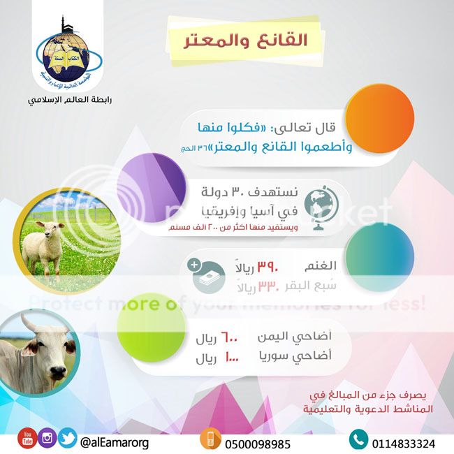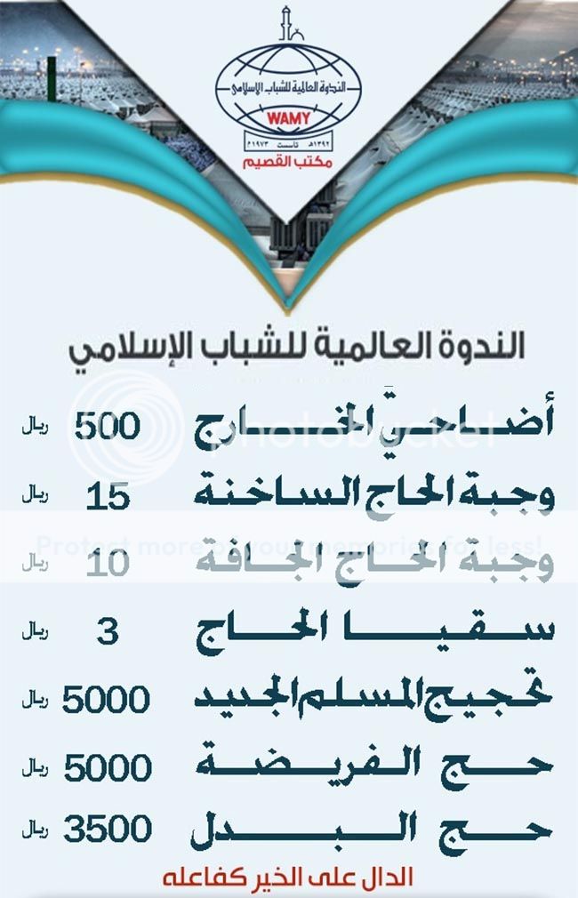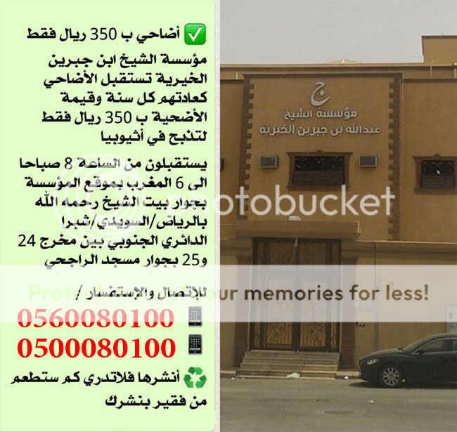 بسم الله الرحمن الرحيم لا يخفى على الجميع أرتفاع أسعار الأضاحي الى أسعار فلكية مبالغ فيها بينما لدينا البديل الأفضل والأقل سعرا وأكثر نفعا فلماذا تضحي بواحدة وأنت تستطيع أن تضحي بثمنها 4 أضحيات ومن أراد أن تذبح الأضحية خارج السعودية في الدول الإسلامية الفقيرة وتوزع على فقراء المسلمين فهذا افضل حسب فتوى الشيخ عبدالله أبن جبرين رحمه الله وهذه صورة للفتوى من موقعه بأنهم أكثر حاجة وفقرا فلماذا نترك أخواننا فريسة لجمعيات التنصير والديانات الباطلة https://i769.photobucket.com/albums/x.../zcxvxcnvm.jpg وهذا فتوى الشيخ العلامة أبن جبرين رحمه الله بتوقيعه https://i769.photobucket.com/albums/x...0/44647327.jpg وهذه صورة لتوزيع لحوم الأضاحي في الخارج https://i769.photobucket.com/albums/x...22e2fa5280.jpg وسنستعرض الجمعيات والمؤسسات الخيرية واسعارها وانت حر في اختيارك لأضحيتك ==================== أولا : الندوة العالمية للشباب الإسلامي ==================== سعر الاضحية 500 ريال فقط وتذبح في الخارج وتوزع على فقراء المسلمين في اكثر من 40 دولة https://i814.photobucket.com/albums/z...4.jpg~original هذا هو موقعهم الرسمي www.wamy.org وهذه هي ارقام جميع فروعهم في المملكة فقط أتصل بهم لمعرفة أقرب فرع اليك والتبرع عن طريق مكاتبهم وهذه هي الطريقة الوحيدة لديهم https://i769.photobucket.com/albums/x...wsx100/443.jpg وهذه أرقام جميع فروعهم على رابط موقعهم بالتفصيل https://www.wamy.org/index.php?option...mid=79&lang=ar ==================== ثانيا : هيئة الاغاثة الاسلامية العالمية ==================== سعر الاضحية 500 ريال فقط وتذبح في الخارج وتوزع على فقراء المسلمين في 45 دولة https://i814.photobucket.com/albums/z...b.jpg~original وتذبح الأضاحي في البلاد الفقيرة لتطعم فقراء المسلمين في مناطق المسلمين للإيداع في حساب الأضاحي وهو حساب رسمي سيخرج لك اسمهم على شاشة الصراف رقم آيبان البنك الأهلي ويمكن التحويل من كل البنوك SA5210000010491999002202 وهذا هو موقعهم الرسمي وفيه أرقام مكاتبهم ومواقعها www.egatha.org يوجد فرعين فقط في مدينة الرياض الفرع الأول : على الدائري الشرقي وانت متجه للشمال تجده على اليمين بين مخرج 14 و 13 مقابل عمر السدحان للملابس رقم الهاتف / 0114930033 الفرع الثاني : على الدائري الجنوبي على مخرج 25 طريق أم المؤمنين عائشة بنت أبي بكر أو مايعرف بشارع الأبراج وأنت على شارع الأبراج متجه شمالا يأتيك موقعهم قبل الإشارة الأولى على اليمين تجد مكتبهم داخل مجمع العالمي لطب للأسنان وهو مقابل لمجمع السلام للإتصالات رقم الهاتف / 0112670664 أما في مدينة جدة فالموقع في حي الرويس ـ شارع حائل ـ بجوار مركز الباروم رقم الهــاتف / 0126574000 للإتصال والإستفسار عن بقية الفروع هذه صورة مأخوذه من موقعهم وفيها جميع أرقامهم في المملكة ووصف لمواقعهم لتصل اليهم حسب منطقتك أو أي منطقة قريبة الى منطقتك https://alfaris.net/up/89/alfaris_net_1381101604.jpg وهذه أرقام جميع فروعهم على رابط موقعهم بالتفصيل https://www.egatha.org/portal/index.p...&id=2&Itemid=9 ==================== ثالثا : المؤسسة العالمية للإعمار والتنمية ==================== سعر الاضحية 390 ريال فقط وسعر سبع البقرة 330 ريال فقط وتذبح في الخارج وتوزع على فقراء المسلمين في 30 دولة وتوزع على فقراء المسلمين ولديهم أضاحي توزع على فقراء سوريا خصوصا ب 1000 ريال وفقراء اليمن ب 600 ريال https://i814.photobucket.com/albums/z...1.jpg~original تذبح الأضاحي في 30 دولة في آسيا وأفريقيا للإيداع في حساب الأضاحي في المؤسسه العالمية لإعمار والتنمية رقم آيبان بنك البلاد ويمكن التحويل من كل البنوك Sa0915000999118519600008 تنبيه يجب أرسال رسالة بعد الايداع فيها بيانات الايداع والمودع وتوضيح نوع التبرع (أضحية) ليخصص التبرع للأضاحي برسالة للجوال 0500098985 وهذا كروكي لموقعهم في مدينة الرياض بالتفصيل https://i769.photobucket.com/albums/x...9.jpg~original للإتصال والإستفسار / 0114833324 0500098985 وهذه ارقامهم من موقعهم الرسمي https://portal.eamar.org/contact_us.php ==================== رابعا : مؤسسة الشيخ عبدالله بن جبرين الخيرية ==================== سعر الاضحية ب 350 ريال وتذبح في أثيوبيا وتوزع على فقراء المسلمين https://i814.photobucket.com/albums/z...3.jpg~original ملاحظة : يجب الحضور الى مقر الجمعية يستقب