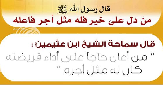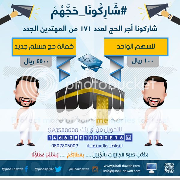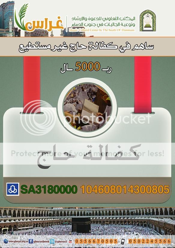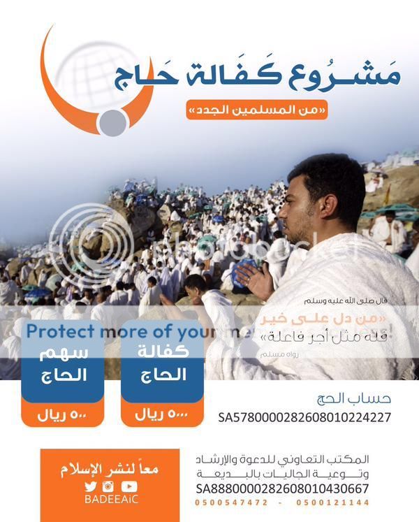 بسم الله الرحمن الرحيم أكفل حاج ليكون لك بإذن الله مثل أجر حجته وأجر صلاتة وكل عمله هناك بإذن الله وتذكر ان العمل هناك مضاعف فكل ركعة يركعها هي ب100 ألف ركعة وسيقضي الحاج هناك أسبوع ولك مثل أجره بإذن الله وهذا مقطع بصوت الشيخ العلامة محمد بن عثيمين رحمه الله يقول أن من كفل حاجا فله مثل أجره https://www.youtube.com/watch?v=d-d_DsJ6wW4 https://i814.photobucket.com/albums/z...d.jpg~original تنبيه مهم جدا : كفالة حاج لاتغني عن الحج الفريضة فإذا كنت لم تحج قبل الآن فيجب ان تحج ولاتغني هذه الكفالة عن حجك الفريضة ================== أولا : كفالة حاج في المكتب التعاوني للدعوة والإرشاد ودعوة الجاليات بالجبيل ================== تكلفة الحاج الواحد 4500 ريال https://i814.photobucket.com/albums/z...8.jpg~original للأتصال والأستفسار / 0507805009 للتبرع في حساب الراجحي الخاص بالحج (حساب رسمي باسم المكتب وسيخرج لك أسم المكتب على شاشة الصراف) 146608010000276 وللتبرع من أي بنك آخر ( الآيبان ) SA1580000146608010000276 ================== ثانيا : كفالة حاج في المكتب التعاوني للدعوة والإرشاد ودعوة الجاليات بالبطحاء في الرياض ================== تكلفة الحاج الواحد 5000 ريال قيمة السهم لكفالة الحاج 500 ريال https://i814.photobucket.com/albums/z...8.jpg~original للأتصال والأستفسار / جوال / 0545999353 جوال / 0505408562 جوال / 0599899406 واتساب / 0500280064 للتبرع في حساب الراجحي الخاص بالحج (حساب رسمي باسم المكتب وسيخرج لك أسم المكتب على شاشة الصراف) 185608010089305 وللتبرع من أي بنك آخر ( الآيبان ) SA1980000185608010089305 ================== ثالثا : كفالة حاج في المكتب التعاوني للدعوة والإرشاد ودعوة الجاليات بجنوب الدمام (غراس ) ================== تكلفة الحاج الواحد 5000 ريال https://i814.photobucket.com/albums/z...z.jpg~original للأتصال والأستفسار / جوال / 0556670505 جوال / 0502245566 للتبرع في حساب الراجحي خاص بالحج (حساب رسمي باسم المكتب وسيخرج لك أسم الجمعية على شاشة الصراف) 104608014300805 وللتبرع من أي بنك آخر ( الآيبان ) SA3180000104608014300805 ================== رابعا : كفالة حاج في المكتب التعاوني للدعوة والإرشاد ودعوة الجاليات بالبديعة ================== تكلفة الحاج الواحد 5000 ريال https://i814.photobucket.com/albums/z...4.jpg~original للأتصال والأستفسار / 0500547472 0500121144 للتبرع في حساب الراجحي خاص بالحج (حساب رسمي باسم المكتب وسيخرج لك أسم الجمعية على شاشة الصراف) 282608010224227 وللتبرع من أي بنك آخر ( الآيبان ) SA5780000282608010224227 ساعدونا في نشر الموضوع في المنتديات والأيميلات والقروبات والدال على الخير كفاعله فلا تدري كم سيكفل من حاج بسبب نشرك |