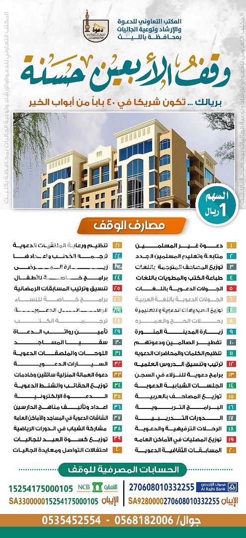 بسم الله الرحمن الرحيم فرصة نادرة ومشروع مميز جداً ( وقف الأربعين حسنة ) المشروع تابع للمكتب التعاوني للدعوة والإرشاد وتوعية الجاليات بالليث بمساهمتك بريال واحد أو أكثر تكون مساهما في 40 باباً من أبواب الخير https://i814.photobucket.com/albums/z...8.jpg~original السهم بريال فقط وبالإمكان المشاركة بأي مبلغ على قدر إستطاعتك فكلما زادت مشاركتك كلما زاد حظك من الأجر بإذن الله عندما تساهم في هذا الوقف ستكون مساهم في 40 مشروع متنوع من مشاريع الدعوة الى الله وهي كالتالي 1- دعوة غير المسلمين 2- متابعة وتعليم المسلمين الجدد 3- توزيع المصاحف المترجمة باللغات 4- طباعة الكتب والمطويات باللغات 5- الجولات الدعوية باللغات 6- الجولات الدعوية باللغة العربية 7- توزيع السيديهات الدعوية والتعليمية 8- رحلات الحج والعمره 9- زيارة المدينة المنورة 10- تفطير الصائمين ودعوتهم 11- تنظيم الكلمات والمحاضرات الدعويه 12- ترتيب وتنسيق الدروس العلميه 13- برامج دعوية للنزلاء في السجن 14- الجلسات الشبابية الدعوية 15- توزيع المصاحف بالعربية 16- البرامج التربوية 17- الدورات التدريبية 18- الرحلات الترفيهية والدعوية 19- توزيع المصليات في الأماكن العامه 20- المسابقات الثقافية الدعوية 21- تنظيم ورعاية الملتقيات الدعوية 22- ترجمه الخطب واعدادها 23- زيارة المرضى 24- برامج خاصة للأطفال 25- تنسيق وترتيب المسابقات الرمضانية 26- برامج خاصة للنساء 27- الرسائل الدعوية 28- ترجمة الكتب 29- تأمين رواتب الدعاة 30- سقيا المساجد 31- اللوحات والملصقات الدعوية 32- السيارات الدعوية 33- دعوة العمالة المنزلية سائقين وخادمات 34- توزيع الحقائب والشنط الدعوية 35- الدعوة الإلكترونية 36- اعداد وتأليف مناهج الدارسين 37- الشاشات الدعوية في المساجد والأماكن العامه 38- مشاركة الشباب في الدورات الرياضية 39- توزيع كسوة العيد للجاليات 40 - احتفالات التواصل ومعايدة الجاليات وكل الاعمال التي ستتم من وراء هذا الوقف المميز ستكون شريكا فيها بإذن الله فأين المشمر للاتصال والأستفسار/ جوال / 0568182006 جوال / 0535452554 رقم حساب الوقف في الراجحي (حساب رسمي وسيخرج لك اسم مكتب الجاليات على شاشة الصراف) 270608010332255 رقم الآيبان للتحويل من جميع البنوك SA9280000270608010332255 رقم حساب الوقف في الأهلي (حساب رسمي وسيخرج لك اسم مكتب الجاليات على شاشة الصراف) 15254175000105 أخواني أرجو نشر الموضوع في القروبات ووسائل التواصل الإجتماعي فالدال على الخير كفاعله وهذه تجارة رابحة مع الله لن تبور فأين المشمر |