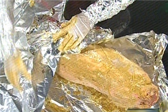![]() خروف محشي المقادير: خروف صغير وزنه 12 - 14 كلغ (مذبوح ومنظف كلياً من الداخل ومُعلّق حتى يجف دمه) 2 كلغ من اللحم المفروم _12 كوب من الأرز، الطويل الحبة المنقوع والمصفّى _24 كوب من الماء (لطهي الارز) ملعقة طعام من الملح (حسب الرغبة) _1،5 كوب من اللوز المقشر والمقطع الى نصفين والمحمر بالسمن نصف كوب من الصنوبر المنقى من الشوائب والمحمر بالسمن _1،5 كوب من الفستق الحلبي المقشر والمحمر بالسمن ملعقة طعام من القرفة المطحونة _ ملعقة طعام من البهار المطحون _ملعقة طعام من الفلفل الأسود المطحون ملعقة طعام من جوز الطيب المطحون __ ملعقتا طعام من الفلفل الابيض المطحون _ ملعقة طعام من حب الهال المطحون كوب من السمن والزيت النباتي (ممزوجان لتحمير الخروف)_ كوب من السمن أو الزبدة (لقلي اللحم المفروم) شرائح من الليمون الحامض _3 اكواب من الماء ◦ طريقه التحضير : ضعي كوب السمن والزيت في قدر كبيرة. قلبي اللحم المفروم على النار حتى يحمر جيداً. اضيفي الملح والتوابل ما عدا الفلفل الابيض. أضيفي الأرز الى اللحم المفروم المقلي وحركيه جيداً ثم أضيفي الماء. عندما يغلي، غطي القدر واتركيها على نار هادئة لمدة نصف ساعة أو حتى ينضج الأرز. اغسلي الخروف جيداً من الداخل والخارج ثم جففيه من الماء. افركيه جيداً بالفلفل الأبيض والحامض من الداخل والخارج. احشي الخروف بالارز المفلفل الى ثلاثة ارباعه واخيطي الفتحة بالابرة والخيط ثم حمريه بالسمن والزيت من كل جوانبه. ![]() ضعي ورق الالومينيوم (سلوفان) على صينية الفرن على أن تتركي زوائد كبيرة من كل جانب ثم ضعي الخروف عليها وصبي فوقه 3 اكواب من الماء. ![]() اربطي ساعديه بفخذيه ليأخذ مساحة أقل. لفي الخروف جيداً بورق الألوميينوم وإن لم تكفي الورقة الأولى لفيه بورقة ثانية كبيرة على أن لا تتركي فراغاً أو منفذاً للهواء. ضعي الخروف في فرن مرتفع الحرارة (220 درجة مئوية) لمدة خمس ساعات. تأكدي من نضجه، بغرس شوكة في فخذه. اضيفي قليلاً من الماء اذا احترق ورق الالومينيوم. اخرجي الخروف المحمر من الفرن. إفتحي ورق الألومنيوم وارفعي الخروف بحذر لوجود بعض السوائل قربه. ضعيه في طبق كبير مخصص للتقديم ورتبي الأرز واللحم على جوانبه (على ان لا تغطي الخروف) ثم رشي عليه اللوز والصنوبر والفستق. قدمي الخروف المحشي ساخناً والى جانبه اللبن الزبادي والسلطات.أو مع الرز