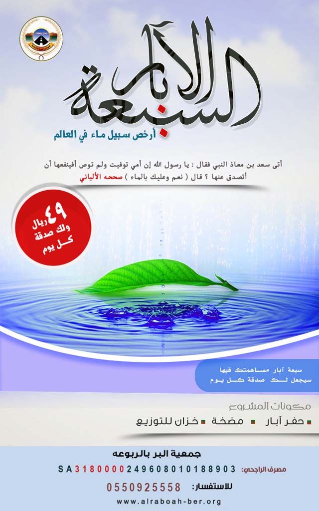 بسم الله الرحمن الرحيم مشروع الآبار السبعة أرخص سبيل ماء في العالم 49 ريال ولك صدقة كل يوم المشروع تابع لجمعية البر الخيرية بالربوعة وهذه صفحة المشروع على موقع جمعية البر الخيرية بالربوعة https://www.alraboah-ber.org/articles.php?action=show&id=17 https://i769.photobucket.com/albums/x...V.jpg~original أتى سعد بن معاذ النبي فقال : يا رسول الله إن أمي توفيت ولم توص أفينفعها أن أتصدق عنها ؟ قال ( نعم وعليك بالماء ) صححه الألباني مكونات المشروع حفر البئر مضخة خزان للتوزيع عندما تساهم في بئر ب 49 ريال فإن مساهمتك مع الآخرين تعطي الآف الصدقات يوميا من شرب الماء لكبد رطبة فيكون نصيبك مقابل المساهمة هو صدقة كل يوم ومن أراد مضاعفة الصدقة اليومية يضاعف الاسهم التي يشارك بها للإتصال والاستفسار / 0550925558 للتبرع في حساب المشروع بنك الراجحي ( حساب رسمي بأسم جمعية البر وسيخرج لك أسمهم على شاشة الصراف ) 249608010188903 للتبرع من أي بنك آخر ( رقم الآيبان ) sa3180000249608010188903 وهذه صفحة المشروع على موقع جمعية البر بالربوعة https://www.alraboah-ber.org/articles.php?action=show&id=17 ساعدونا في نشر الموضوع في المنتديات والإيميلات والقروبات والدال على الخير كفاعله فكم من كبد رطبة ستسقيها هذه الآبار ولك أجرها |