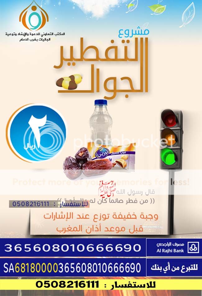 بسم الله الرحمن الرحيم أرخص تفطير في المملكة وأكبر تفطير أولا : تفطير مكتب الجاليات بغرب الدمام وجبة ب 2 ريال فقط https://i814.photobucket.com/albums/z...0.jpg~original للاستفسار / 0508216111 لدعم حساب المشروع على مصرف الراجحي ( حساب رسمي وسيخرج لك أسم مكتب الجاليات على شاشة الصراف ) 365608010666690 للتبرع ومن أي بنك آخر ( الآيبان ) Sa68180000365608010666690 ==================== ==================== ثانيا : تفطير مكتب جاليات البلد بجده التفطير ب 3 ريال فقط https://alfaris.net/up/89/alfaris_net_1402614678.jpg المكتب بجانب محطة النقل الجماعي بجده وينطلق يوميا بعد العصر عشرات الباصات الى جميع مدن المملكة تنطلق بالمسافرين الصائمين فتعطى لهم وجبات يفطرون بها عند حلول موعد الإفطار أثناء سفرهم وبعض هذه الرحلات متجهة الى مكة والمدينة للاستفسار / 0549656545 0564074064 ==================== ==================== ثالثا : تفطير مكتب جاليات شمال حائل فقط ب 3 ريال وتوزع الوجبات عند الإشارات قبل المغرب https://i814.photobucket.com/albums/z...1.jpg~original وتتكون من ماء ولبن وتمر وعصير وكيك للاستفسار / 0535652444 لدعم حساب المشروع على مصرف الراجحي ( حساب رسمي وسيخرج لك أسم مكتب الجاليات على شاشة الصراف ) 516608010107701 للتبرع ومن أي بنك آخر ( الآيبان ) Sa9380000516608010107701 الرجاء المساعدة في نشر الموضوع في المنتديات والإيميلات والقروبات وتذكر ان الدال على الخير كفاعلة |
