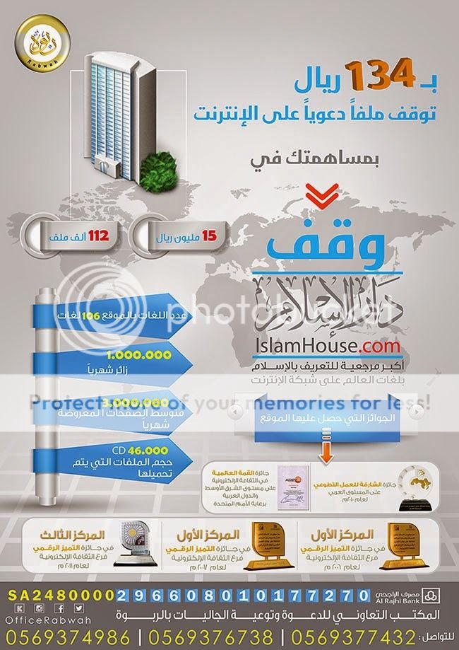 بسم الله الرحمن الرحيم أفضل مايمكن أن تساهم فيه وتدخر لنفسك ولوالديك عند الله يوم لاينفع مال ولابنون أن تساهم ولو بسهم واحد في أوقاف خدمت الإسلام والمسلمين أوقاف خدمت الفقير والمسكين وحافظ القرآن واليتيم والداعية ومعلم كتاب الله ومتعلمه والقائم عليه ونشرت الاسلام فلم تعد الاوقاف حكراً على الأغنياء فالفقراء كذلك يمكنهم بناء أوقاف والمشاركة فيها إليكم هذه الأوقاف التي سيستفيد منها آلاف المسلمين بإذن الله فلا تبخل على نفسك بالمساهمة فيها عنك وعن والديك ومن تحب ============ أهم وقف في العالم ============ فرصة العمر للمشاركة في أهم وقف في العالم https://i814.photobucket.com/albums/z...3.jpg~original وقف موقع دار الإسلام islamhouse ( إسلام هاوس ) الوقف يقوم بالتمويل والصرف على موقع دار الإسلام www.islamhouse.com أضخم موقع إسلامي في العالم ب ( ١٠٦ ) لغة ويزوره شهريا حوالي مليون زائر وقد حصد الموقع كثير من الجوائز المحليه والعالمية ويعتبر أكبر مرجعية في العالم للتعريف بالإسلام بلغات العالم على شبكة الإنترنت وهذا الوقف يقوم بتأمين تكاليف السيرفرات ورواتب الدعاة ورفع الكتب وكل شيئ يحتاجه الموقع السهم ب ١٣٤ ريالاً توقف ملفاً دعوياً على الإنترنت يدوم بإذن الله طول العمر وبعد الممات. التبرع مفتوح بأي مبلغ تستطيعه الموقع والوقف كما هو معروف تابع للمكتب التعاوني للدعوة وتوعية الجاليات بالربوة https://i814.photobucket.com/albums/z...1.jpg~original للإتصال والإستفسار / 0569377432 0569376738 0569374986 للتواصل واتساب : 0569374986 للتبرع المباشر في حساب الوقف في مصرف الراجحي (حساب رسمي وسيخرج لك أسم الجاليات على شاشة الصراف) 296608010177270 للتبرع من أي بنك آخر ( رقم الآيبان ) SA2480000296608010177270 ============ وقف الدعوة النسائي ============ تابع للمكتب التعاوني للدعوة و الإرشاد وتوعية الجاليات بعنيزة. قيمة السهم 50 ريال وبالإمكان التبرع باي عدد من الأسهم من خلال هذا الوقف ستساهم بإذن الله في :- - إقامة 150 درس ومحاضرة شهريا . - دخول ما يقارب 20 مسلمة جديدة في الإسلام شهريا. - حضور ما يقارب من 300 امرأة و فتاة شهريا لمناشط المكتب الدعوية . - توزيع الكتب والمصاحف على الحاضرات من المسلمات وغير المسلمات . https://i769.photobucket.com/albums/x...5.jpg~original للاتصال والاستفسار : جوال / 0553643030 جوال /0553634040 للتبرع في بنك الراجحي (حساب رسمي بأسم مكتب جاليات عنيزة وسيخرج لك أسم المكتب على شاشة الصراف) 565608010002050 للتبرع في بنك البلاد (حساب رسمي بأسم مكتب جاليات عنيزة وسيخرج لك أسم المكتب على شاشة الصراف) 999300001090106 ============ وقف بلاغ الدعوة ============ تابع لمكتب الدعوة في طلعة التمياط ف ب 63 ريال شهريا ولمدة سنه يكون لك وقف بإذن الله https://i769.photobucket.com/albums/x...0.jpg~original وهذه صفحة الوقف من موقع الجاليات https://www.d-tala.com/projects/11/ للاتصال والاستفسار : 0532313072 للتبرع في بنك الراجحي (حساب رسمي بأسم المكتب وسيخرج لك أسمهم على شاشة الصراف) 169608010270038 للتحويـل من أي بنك آخر ( الآيبان ) SA7380000169608010270038 ============ وقف الفويلق ============ تابع لمكتب دعوة الجاليات في الفويلق وقيمة القدم المربع ب 85 ريال فقط https://i769.photobucket.com/albums/x...0.jpg~original للإتصال والإستفسار / جوال / 0556150900 ثابت / 063920900 للتبرع في حساب الوقف في بنك الراجحي (حساب رسمي بأسم جاليات الفويلق وسيخرج لك أسمهم على شاشة الصراف) 398608010035277 للتحويـل من أي بنك آخر ( الآيبان ) SA4780000398608010035277 ============ وقف الوالدين ============ تابع لجمعية تحفيظ القرآن بالخبراء باستقطاع شهري ب 50 ريال يكون لك خلال سنتين وقف بإذن الله تعالى https://i769.photobucket.com/albums/x...0.jpg~original صفحة المشروع على موقع الجمعية https://www.alkbraquran.com/?page_id=14 للتبرع في بنك الراجحي (حساب رسمي بأسم الجمعية وسيخرج لك أسمهم على شاشة الصراف) 265608010023232 للتحويـل من أي بنك آخر ( الآيبان ) SA2480000265608010023232 ============ وقف الحياة ============ تابع لمكتب الدعوة في المجمعة سعر المتر ب 1400 ريال وبالإمكان المشاركة بأي مبلغ https://i814.photobucket.com/albums/z...7.jpg~original للاتصال والاستفسار : جوال / 0504323949 للتبرع في بنك الراجحي (حساب رسمي بأسم الجاليات وسيخرج لك أ