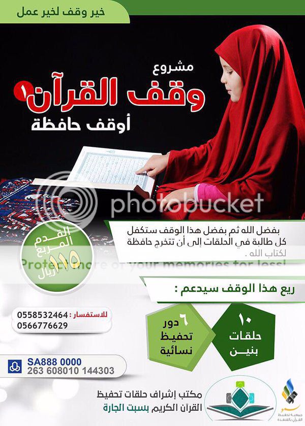 بسم الله الرحمن الرحيم ب 115 ريال فقط توقف حافظة قرآن بحيث تصبح هذه الحافظة للقرآن وقف لك طول حياتها ليكون لك بإذن الله أجر حفظها وقرآئتها القرآن وتعليمها غيرها وتحفيظهم القرآن المشروع تابع لمكتب إشراف حلقات تحفيظ القرآن الكريم بسبت الجارة وهي جمعية رسمية تحت إشراف وزارة الشؤون الإسلامية عند مساهمتك ب ١١٥ ريال لمرة واحدة في الوقف ستوقف حافظة لكتاب الله بإذن الله لأن ريع ١١٥ ريال طوال عمر المبنى سيعطي مبلغ يكفي لتخريج حافظة للقرآن لتفوز بإذن الله بأجرها وأجر حفظها للقرآن طوال حياتها https://i814.photobucket.com/albums/z...3.jpg~original لا يفوتك نشر وتحفيظ كتاب الله بمساهمتك في هذا الوقف المهم جداً فلديهم : 6 دور تحفيظ نسائية و 10 حلقات تحفيظ للبنين للإتصال والإستفسار 0558532464 0566776629 للتبرع في الحساب في بنك الراجحي (وهو حساب رسمي باسم مكتب إشراف حلقات تحفيظ القرآن الكريم بسبت الجارة وسيخرج لك على شاشة الصراف) 263608010144303 وللتبرع من أي بنك آخر ( رقم الآيبان ) SA8880000263608010144303 انشرها فربما بنشرك هذا الموضوع كتب في ميزانك كثير من حافظات كتاب الله فالدال على الخير كفاعله |