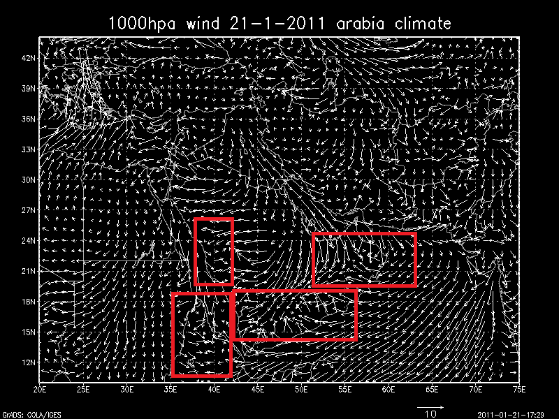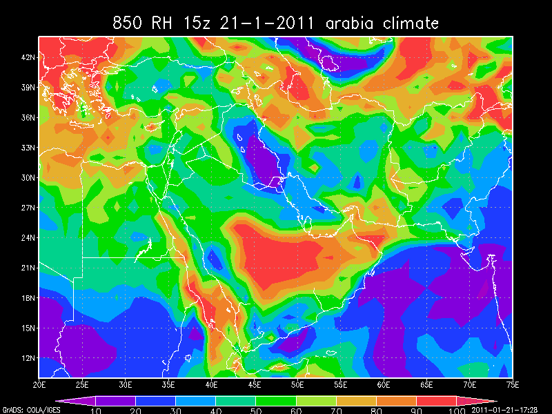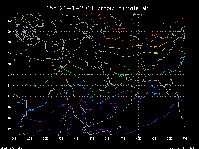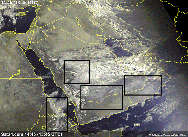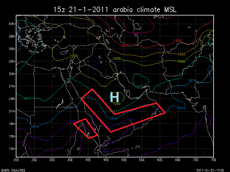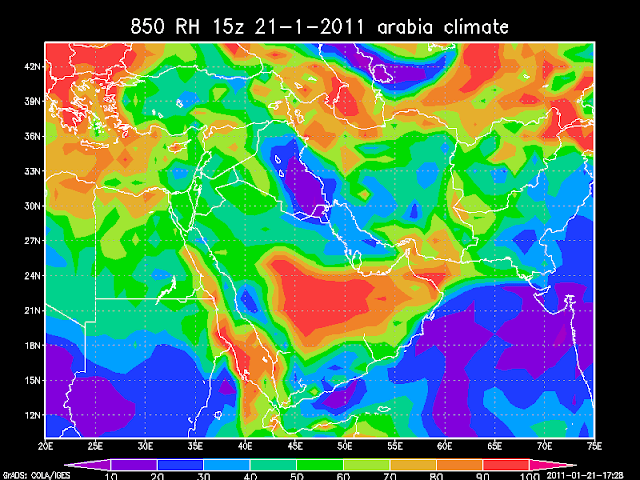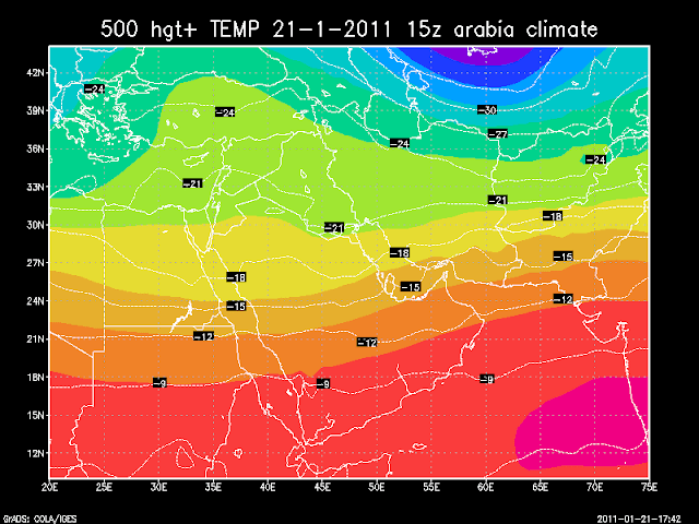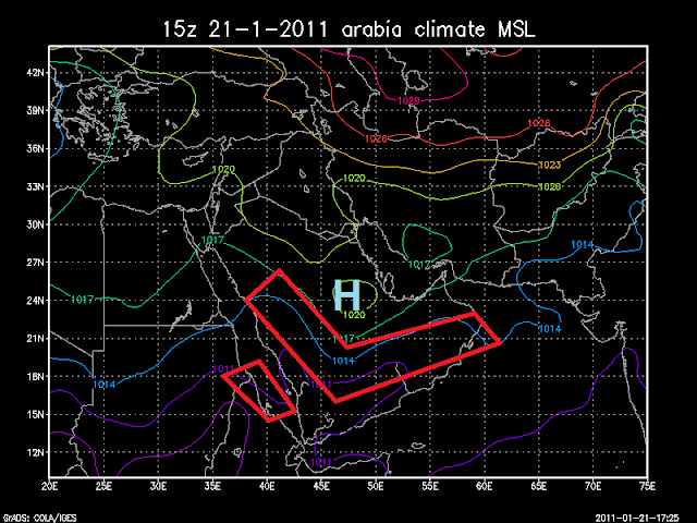 ![]() بالرغم من تأثير المرتفع الجوي فوق الجزيرة العربية ، لماذا تظهر الغيوم الكثيفة وتتساقط الامطار الغزيرة احيانا ! من يلاحظ خرائط الاقمار الصناعية في فترة 19-22 يناير من 2011 ، كذلك خرائط الضغط الجوي السطحي ، سيلاحظ ان السحب والامطار تتساقط في منطقة تسيطر عليها ذراع للمرتفع الجوي السيبيري ، لكن بالعودة الى التحليل الذي قمت بوضعه سابقا عن الحالة الجوية عندما اشارت بجملة "تصعد الكتلة الرطبة فوق كتلة جافة باردة " ، من هذه الجملة سندخل في تفاصيل دقيقة لنوضح الية الصعود هذه ، وكيف نحددها في الاقمار الصناعية ايضا. بالبداية مواصفة المرتفع الجوي : مرتفع جوي ذات امتداد افقي حاد بارتفاع راسي يقدر بين 1500 مترا الى 2000 مترا ، (من السطح حتى مستوى 850-800 مللي بار) ، هذا المرتفع الجوي ضحل ، اي يتواجد في الطبقات المنخفضة والسطحية ، ويدل ذلك على وجود كتلة هوائية جافة باردة سطحية من الجو، وكما نعلم ان الهواء البارد ثقيل الوزن واكثر كثافة ، والهواء الحار اقل كثافة واخف وزنا في ثبات المساحة المقاسة ، يعتبر هذا المرتفع الجوي جزء من امتداد سيبيرية متوغلة الى المنطقة مترافق مع كتلة هوائية باردة شمال الجزيرة العربية . تشير هذه الخريطة الجوية الى مركز هذا المرتفع الجوي السيبيري الاصل ، حيث يقوم بدفع رياح باردة نحو وسط الجزيرة العربية حتى جنوبها ، كذلك منخفض البحر الاحمر المحصور جنوبا وغربا ، وكما نلاحظ بوضوح ان المرتفع الجوي يؤثر على المناطق الممطورة. خرائط الرياح : رياح باردة شمالية الى شمالية شرقية نحو جنوب الجزيرة العربية قادمة من شمال الجزيرة العربية ، ويعني المناطق التي تتاثر بكتلة هوائية جافة باردة ، وهذا يدل على تدفق هواء بارد عبر الطبقات السطحية والمنخفضة من الجو ناحية جنوب الجزيرة العربية ، ملاحظ ايضا كيف يقوم منخفض البحر الاحمر بسحب الرياح التجارية نحو مركزه جنوب الجزيرة العربية وهذه الرياح التجارية مثقلة بشكل كبير في الرطوبة الجوية ، واصتدام هذه الرياح بشكل عنيف مع الرياح الباردة ، ايضا عند منطقة البحر الاحمر، توضيح : نقطة التقاء قوية بين الرياح الباردة السطحية عند المربعات الحمراء وهي مناطق محددة بوضوح ، ملاحظة ان التيارات الدافئة رطبة جدا ، وهي اخف وزنا من الباردة ، فلذلك تصعد فوق هذه التيارات الباردة الجافة ، ايضا لوجود هواء بارد متسرب عبر الطبقات الجوية العلوية من الجو مما يساند صعود هذه التيارات الرطبة بسهولة، بسبب وجود حوض علوي بارد شمال الجزيرة العربية . ليست فوائد المنخفض العلوي شمال الجزيرة العربية فقط بتبريد الطبقات العلوية من الجو ، بل كذلك جذب منخفض البحر الاحمر بقوة نحو الشمال ، مما يخلق هذا الاصتدام العنيف ، وويصعد منخفض البحر الاحمر على ظهر المرتفع الجوي الضحل ويؤدي الى دفع رطوبة شديدة نحو مختلف الطبقات الجوية. مستوى 850 مللي بار ، ويظهر الكتلة الجافة الباردة ، لاحظ الفاصل بين شمال وجنوب الجزيرة العربية ، مما يوضح الية الصعود وظهور السحب الماطرة بدءا من جنوب الرياض وغرب السعودية ثم تنتشر نحو قطر والبحرين والامارات ، كذلك ظهورها من جنوب الجزيرة العربية كما حددنا بالمربعات الحمراء ، وهذا سنوضحه بالاقمار الصناعية . توضيح الرطوبة الجوية فوق 850 مللي بار ، لاحظ مصدر الرطوبة ، ( كأنها من غرب الجزيرة العربية ) وايضا من المناطق الاستوائية الافريقية "مساند " وفي الحقيقة المصدر الرئيسي هنا بحر العرب ، فالتيارات الرطبة التي تم تحديدها في الخرائط السطحية(المربعات الحمراء) تبدأ في الصعود فوق هذه الكتلة الجافة وهذا واضح جدا من خرائط الرطوبة كيف تظهر "فوق المرتفع الجوي " ويدل على ان الكتلة الرطبة الدافئة صعدت على ظهر هذه الكتلة الجافة الباردة المترافقة مع المرتفع الجوي السيبيري . خرائط 500 مللي بار ، وتظهر مركز المرتفع العربي موجود غرب الهند ، وهو يساند بدفع الرطوبة الجوية كذلك عبر طبقات الجوية العليا نحو جنوب الجزيرة وجنوب شرقها . كذلك مشاهدة موجة قصيرة باردة وهي الكتلة البار