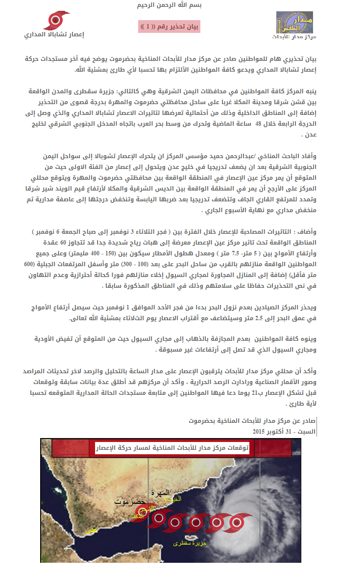 بيان تحذيري رقم ((1)) لكافة المواطنين في المحافظات اليمنية التالية تحسبا لإعصار تشابالا تفاصيل ![]()