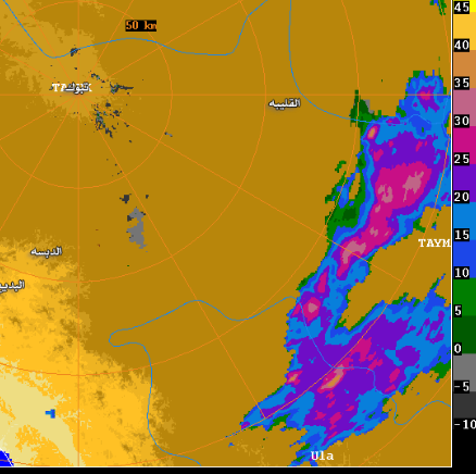 1.25 الرعد يسمع مع رش مطر خفيف على غرب بني عيسى بالباحة 1.45 امطار متوسطة جنوب شرق العيص مشت منها الشغايا 1.50 بردية قوية تضرب خوعاء (شرق سكاكا 24كم) 2.00 معاودة الأمطار الغزيرة بالهطول من جديد على أملج 2.05 أمطار من خفيفة إلى متوسطة حول قرية الجهراء (جنوب تيماء 80كم) === آخر أخبار الطقس السحب التي على أملج والوجه بدأت تتحرك ناحية الجنوب والجنوب الشرقي والله أعلم قناة البراري |