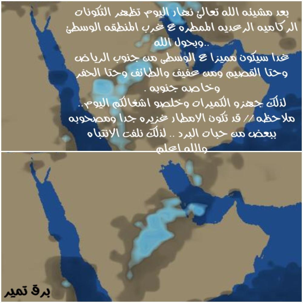 ............. توقعات الامطار تبدأ اليوم بمشيئة الله تعالى الفرصة لهطول امطار رعدية على جنوب غرب السعودية وكذلك الوسطى والشرقية وبعض الاجزاء من شمال شرق السعودية كذلك على منطقة القصيم والله اعلم |