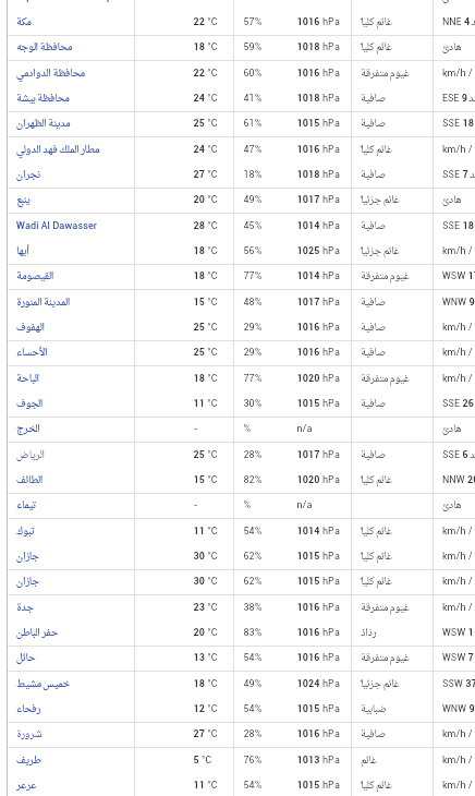 حالة السماء ودرجات الحرارة والرطوبة لأهم مدن المملكة الآن : https://pbs.twimg.com/media/BbWlZKAIUAAUuTK.png:large أبرد المدن طريف ودرجتها 5ْ وأدفأ المدن جازان ودرجتها 30ْ .. |