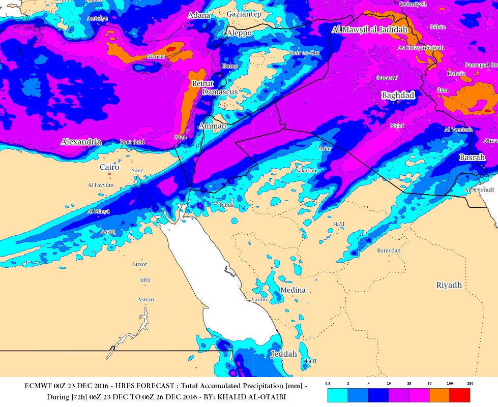 لمركز الأوروبي - النموذج عالي الوضوح : توقعات تراكم هطول الأمطار بمشيئة الله خلال 72 ساعة بين 23-26 ديسمبر