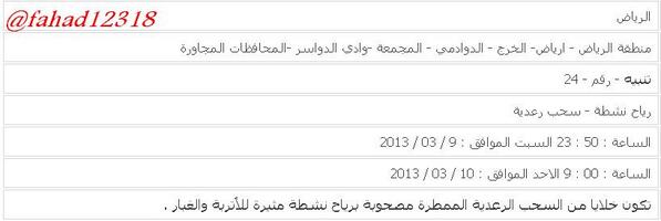 منطقة الرياض-الرياض-الخرج -الدوادمي-المجمعة -وادي الدواسر-المحافظات المجاورة ( رياح نشطة - سحب رعدية ) الى 9ص https://pbs.twimg.com/media/BE88eD3CYAEwZjs.jpg تنبيه : منطقة الشرقية - الدمام- الظهران - الأحساء - الجبيل-المحافظات المجاورة ( أمطار رعدية ) من الساعة 2ص الى 10ص https://pbs.twimg.com/media/BE89NCwCAAAqSZo.jpg |