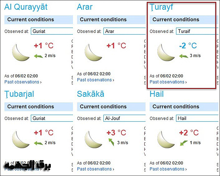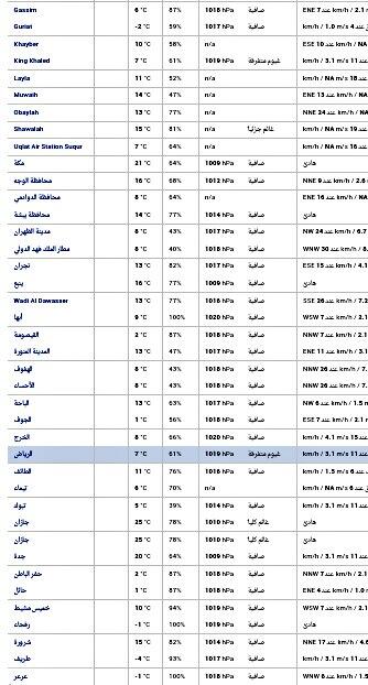 طريف : 3 تحت الصفر القريات : 1 تحت الصفر طبرجل : 1 تحت الصفر رفحاء : صفر عرعر : 1 حائل : 1 سكاكا الجوف : 3 |