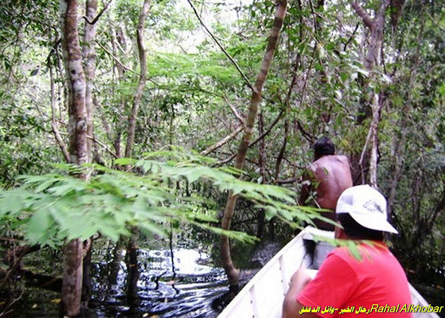 الامازون ورحلة المغامرة بين الاناكوندا والبيرانا-رحال الخبر من منطقة الأمازون نرحب بكم الحمد لله والصلاة والسلام على نبينا محمد وعلى آله وصحبه ومن والاه .. من هنا ومن حوض الأمازون النهر الأكبر بالعالم احدثكم أنا رحّالكم رحّال الخبر من هذه البقعة العجيبة والغريبة بما فيها من طبيعة غيربة ، يسعدني أن أتجول في هذا المكان القصيّ والبعيد والغريب والذي يعتبر من عجائب الدنيا بما يحمل من غابات مطرية وحيوانات مازالت على بيئتها لولا تعرض البشر لها ولو قليلا نظرا للكثافة المائية والغابات المتسعة التي تحد من استعمار الارض. ولا شك أن الامازون بنهرها العظيم تعتبر رئة الارض نسبة لكثافة الاشجار على مستوى العالم وتنوع البيئة هنا ، وسوف نتحدث بها مع الصور لكي نثري الموضوع كاملا إن شاء الله تعالى . بداية الرحلة : في بداية كل رحلة يكون الإستعداد النفسي والمعرفي والبدني وخاصة إن وجهتنا في هذه الحلقة عن منطقة مازالت في نفسي مطلوبة وتتوق اليها لكشف كل شبر فيها ولعلي اوفق بنشر ما أراه أليكم لنتشارك سوية في جولة معرفية مصورة لهذه المنطقة البديعة. بالطبع كانت هذه الرحلة ضمن رحلات متتابعة لجنوب أمريكا وقد سبق لي أن زرت البرازيل جنوبها وغربها ووضعت في النت الحلقات الاولى والثانية والثالثة عن كلا من ريو دي جانيرو وساوباولو وفوز دي إغواتسو ومنطقة الشلالات الكبرى وها انا الآن أختم البرازيل في موضوع شيق وممتع أكشف فيه جانب مازال غامضا للعديد منّا وأنا اولهم ، فكل ما سمعنا ورأينا عبر التلفزيون وما يدار فيه من حلقات متقطعة عن هذه البقعة الجميلة من كوكبنا العظيم (هذا خلق الله فأروني ماذا خلق الذين من دونه ..) وحينما نبدا نعطي أخي القاريء تصور للمكان وشيء من المعرفة لتكون بدايتنا مرتبة ومنسقة . ![]() منطقة نهر الامازون وحوضه المتسع من شرق القارة لغربها منطقة حوض الامازون نهر الأمازون يقع في أمريكا الجنوبية. وهو أكبر نهر في العالم من حيث الحجم والعمق، ومن حيث معدل التدفق الذي يفوق معدل تدفق أكبر ثماني أنهار في العالم الذين يلونه في الترتيب مجتمعين. يملك الأمازون أكبر حوض تصريف في العالم، وبذلك يمثل ما يقرب من خمس إجمالى تدفق الأنهار في العالم. يزداد اتساع أجزاء من الأمازون عن 190 كيلومتر (120 ميل) أثناء موسم الأمطار. ونظرا لاتساعه يطلق عليه أحيانا البحر النهر. لا يقاطع الأمازون أية جسور.السبب في ذلك ليس اتساعه، فعرضه مناسب لإمكانيات المهندسين المعاصرين على بناء جسور. إنما السبب أن الجزء الأكبر من مياه النهر تتدفق عبر الغابات الاستوائية المطيرة، والتي بطبيعتها الطرق بها قليلة وكذلك المدن، وبالتالى لا حاجة لأية جسور. في حين أن نهر الأمازون هو أغزر نهر في العالم، إلا أن البيانات الحالية للجمعية الجغرافية تشير إلى أن الأمازون هو ثاني أطول نهر في العالم بعد نهر النيل. ومع ذلك يجادل بعض العلماء خاصة من البرازيل وبيرو بخصوص ذلك. ويصب نهر الأمازون شرقا بالمحيط الاطلسي ولعل من العجيب وجود جزيرة في الطرف الشرقي وتسمى(ماراجو) وتدهش حين تعرف حجمها فهي بحجم جزيرة سويتزرلاند ، وهي بهذا الحجم تعتبر أكبر جزيرة بالعالم تقع بين نهر وبحر واليكم صورة من الأقمار الأصطناعية. ولعل من عجيب وعظيم إتساع نهر الأمازون عرضا أنه يصل المسافة بين ضفتيه في الطرف الأخير الذي يصب بالمحيط فيكون عرضه كطول نهر التايمز في إنجلترا إذ يصل عرضه نحو ٣٣٠ كيلوتر. يعد حوض الأمازون أكبر حوض تصريف في العالم، حيث يغطي نحو 40 في المئة من مساحة أمريكا الجنوبية، أى ما يقرب من 6.915.000 كيلو متر مربع (2،670،000 ميل مربع). وتتجمع مياهه من 5 درجات من دوائر العرض الشمالية حتى 20 درجة من دوائر العرض الجنوبية.وتقع أبعد منابعه غربا بين هضبة الانديز في دولة الإكوادور والبيرو، بالقرب من المحيط الهادئ ومن عجيب هذا النهر وحجمه العظيم أنه يصب بكمّ هائل من المياه في المحيط الأطلسي يصل إلى 300،000 متر مكعب في الثانية أثناء موسم الأمطار. يمد الأمازون محيطات العالم بحوالى 20 ٪ 