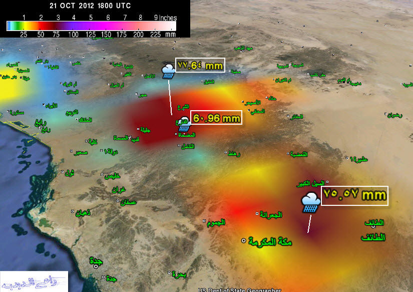 رصد ناسا لكمية الامطار التي هطلت اليوم على المنطقة الغربية ..ويبقى الرصد الحقيقي لدى الارصاد السعودية بلا شك